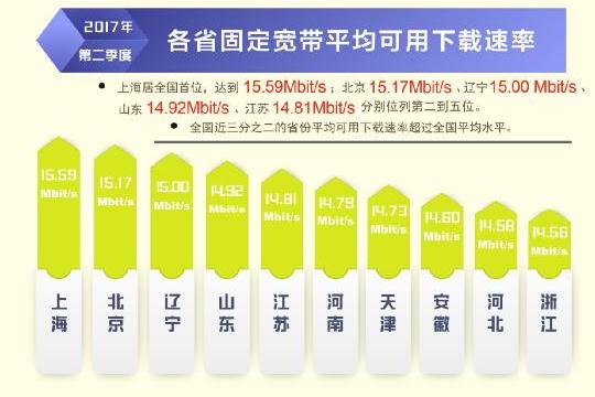 日前,寬帶發(fā)展聯(lián)盟發(fā)布了第 16 期《中國寬帶速率狀況報告》(2017 年第二季度)。報告顯示 2017 年第二季度我國固定寬帶網(wǎng)絡(luò)平均下載速率達到 14.11Mbit/s,比 2017 年第一季度提高了1.1Mbit/s,同比去年第一季度提升了 34.8%。自 2015 網(wǎng)絡(luò)“提速降費”工作開展以來,我國固定寬帶可用下載速率連續(xù) 10 個季度持續(xù)提升,總提升幅度達到 3.3 倍。同時,我國移動寬帶用戶使用 4G 網(wǎng)絡(luò)訪問互聯(lián)網(wǎng)時的平均下載速率達到 13.46Mbit/s,環(huán)比 2017 年第一季度也有 14.2%的提升。