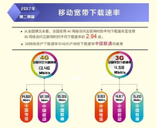 根據(jù)本次報告,除西藏自治區(qū)外,全國其他所有省級行政區(qū)域固定寬帶平均下載速率均超過 12Mbit/s,上海、北京、遼寧率先超過或達到了 15Mbit/s,位列全國前三,山東、江蘇緊隨其后。在直轄市和省會城市固定寬帶下載速率排行榜上,上海、北京、濟南、天津、福州位居前五位。從移動寬帶網(wǎng)速狀況看,重慶、福建、遼寧、江蘇、河北的 4G 網(wǎng)絡(luò)用戶下載速率排在全國省級行政區(qū)前五位;不同電信運營企業(yè)中,中國聯(lián)通的 3G 網(wǎng)絡(luò)用戶下載速率和 4G 網(wǎng)絡(luò)用戶下載速率均最高,分別達到 5.20 Mbit/s 和 15.05 Mbit/s。