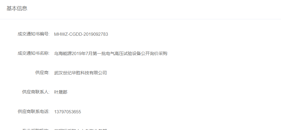 熱烈祝賀:武漢世紀華勝公司國家能源集團烏海能源2019年7月第一批電氣高壓試驗設(shè)備公開詢價采購中中標