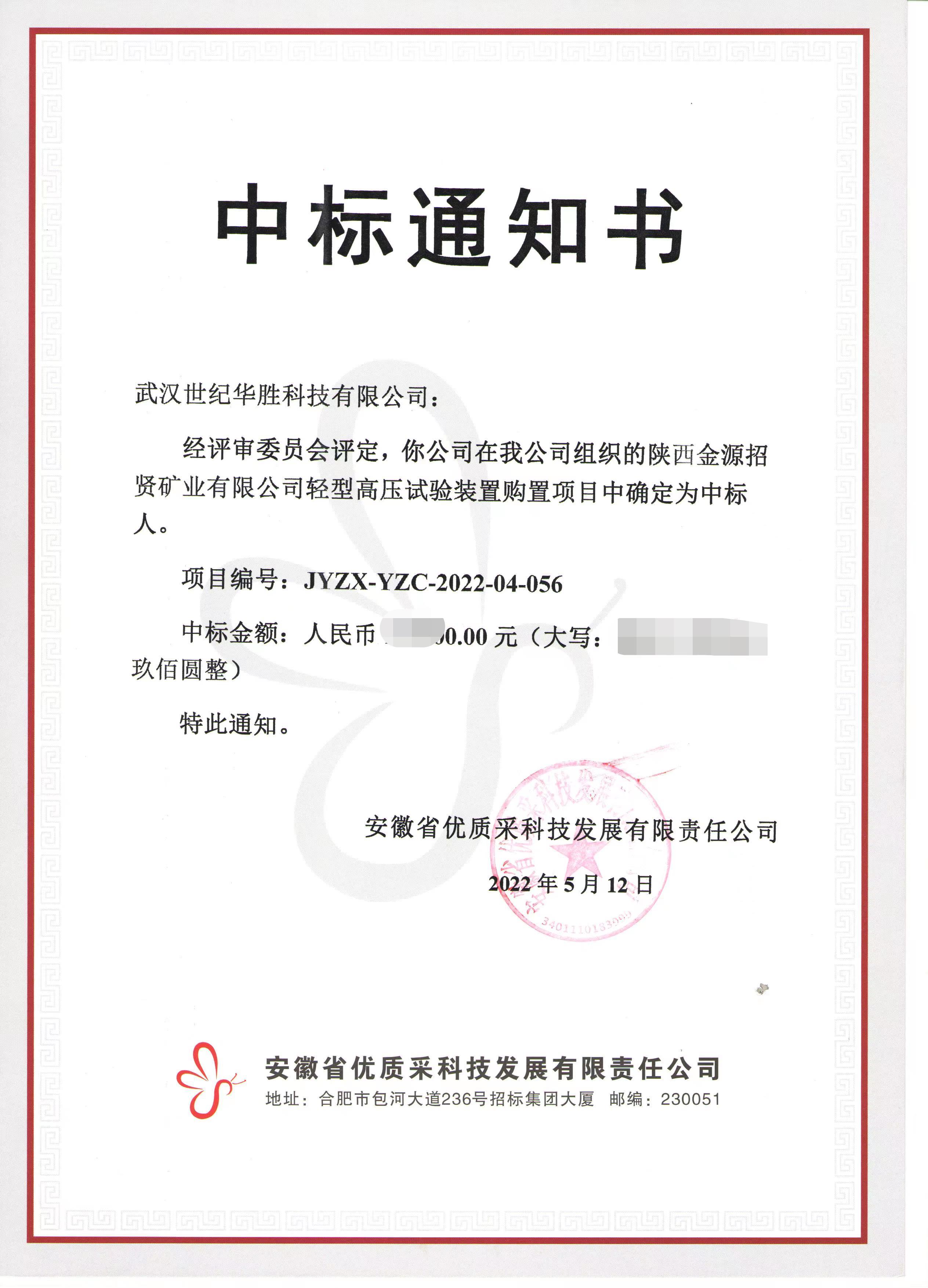 熱烈祝賀武漢世紀(jì)華勝科技有限公司在陜西金源招賢礦業(yè)有限公司輕型高壓試驗(yàn)裝置購置項(xiàng)目中中標(biāo)